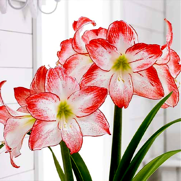 The plant grows from a large, rounded bulb that sends up a thick, hollow flower stalk called a scape, which can reach 12-24 inches tall. Each stalk typically bears 2-6 large, lily-like flowers that bloom in succession. The strap-shaped leaves are glossy green and usually emerge after or alongside the flowers, growing up to 18 inches long.