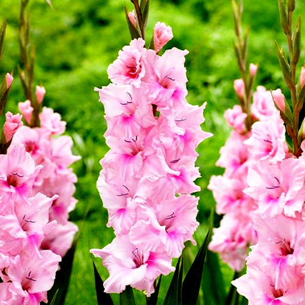 Native primarily to South Africa, with some species from the Mediterranean region, gladioli have become popular garden plants worldwide. They bloom in summer and are prized as cut flowers due to their impressive height and long-lasting blooms. The plants prefer full sun and well-drained soil, and in colder climates, the corms must be lifted and stored indoors during winter. Gladioli are excellent for creating dramatic vertical elements in flower gardens and are commonly grown in rows for cutting. There are over 260 species and countless cultivars, ranging from miniature varieties to giant exhibition types.