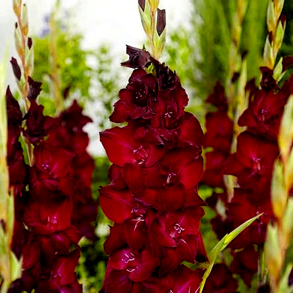 Gladiolus is a genus of perennial flowering plants that grow from corms (bulb-like underground storage organs) and are beloved for their tall, dramatic flower spikes. These striking plants produce sword-shaped leaves and towering stems that can reach 2-5 feet in height, topped with multiple funnel-shaped flowers arranged in dense, vertical clusters called racemes.