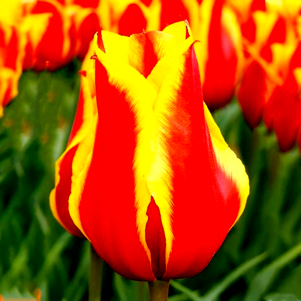 Tulips are iconic spring-blooming bulbs renowned for their elegant cup-shaped flowers and wide array of colors and forms. These bulbs produce single stems with distinctive flowers that can be found in virtually every color except true blue, including solid hues, bi-colors, and striking patterns with stripes, flames, or picotee edges.