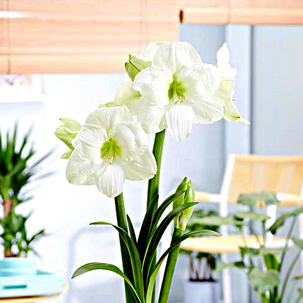 The plant grows from a large, rounded bulb that sends up a thick, hollow flower stalk called a scape, which can reach 12-24 inches tall. Each stalk typically bears 2-6 large, lily-like flowers that bloom in succession. The strap-shaped leaves are glossy green and usually emerge after or alongside the flowers, growing up to 18 inches long.