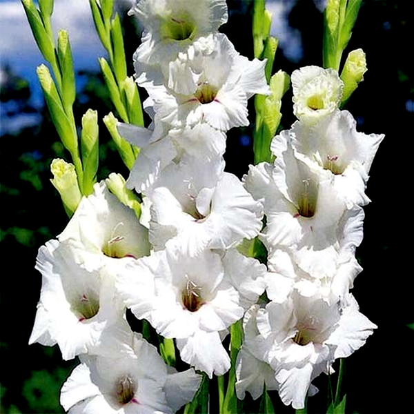 Gladiolus is a genus of perennial flowering plants that grow from corms (bulb-like underground storage organs) and are beloved for their tall, dramatic flower spikes. These striking plants produce sword-shaped leaves and towering stems that can reach 2-5 feet in height, topped with multiple funnel-shaped flowers arranged in dense, vertical clusters called racemes.