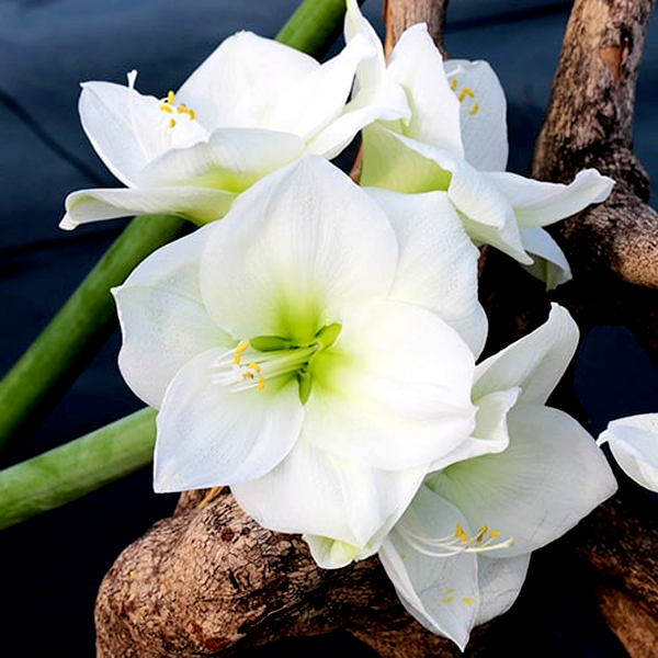 The plant grows from a large, rounded bulb that sends up a thick, hollow flower stalk called a scape, which can reach 12-24 inches tall. Each stalk typically bears 2-6 large, lily-like flowers that bloom in succession. The strap-shaped leaves are glossy green and usually emerge after or alongside the flowers, growing up to 18 inches long.
