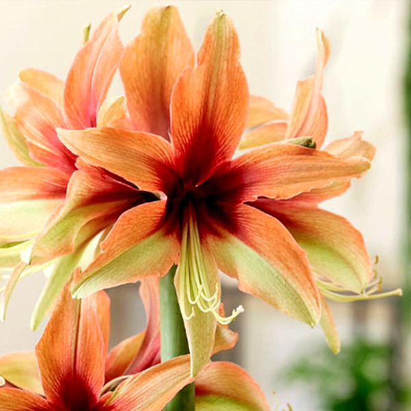 The plant grows from a large, rounded bulb that sends up a thick, hollow flower stalk called a scape, which can reach 12-24 inches tall. Each stalk typically bears 2-6 large, lily-like flowers that bloom in succession. The strap-shaped leaves are glossy green and usually emerge after or alongside the flowers, growing up to 18 inches long.